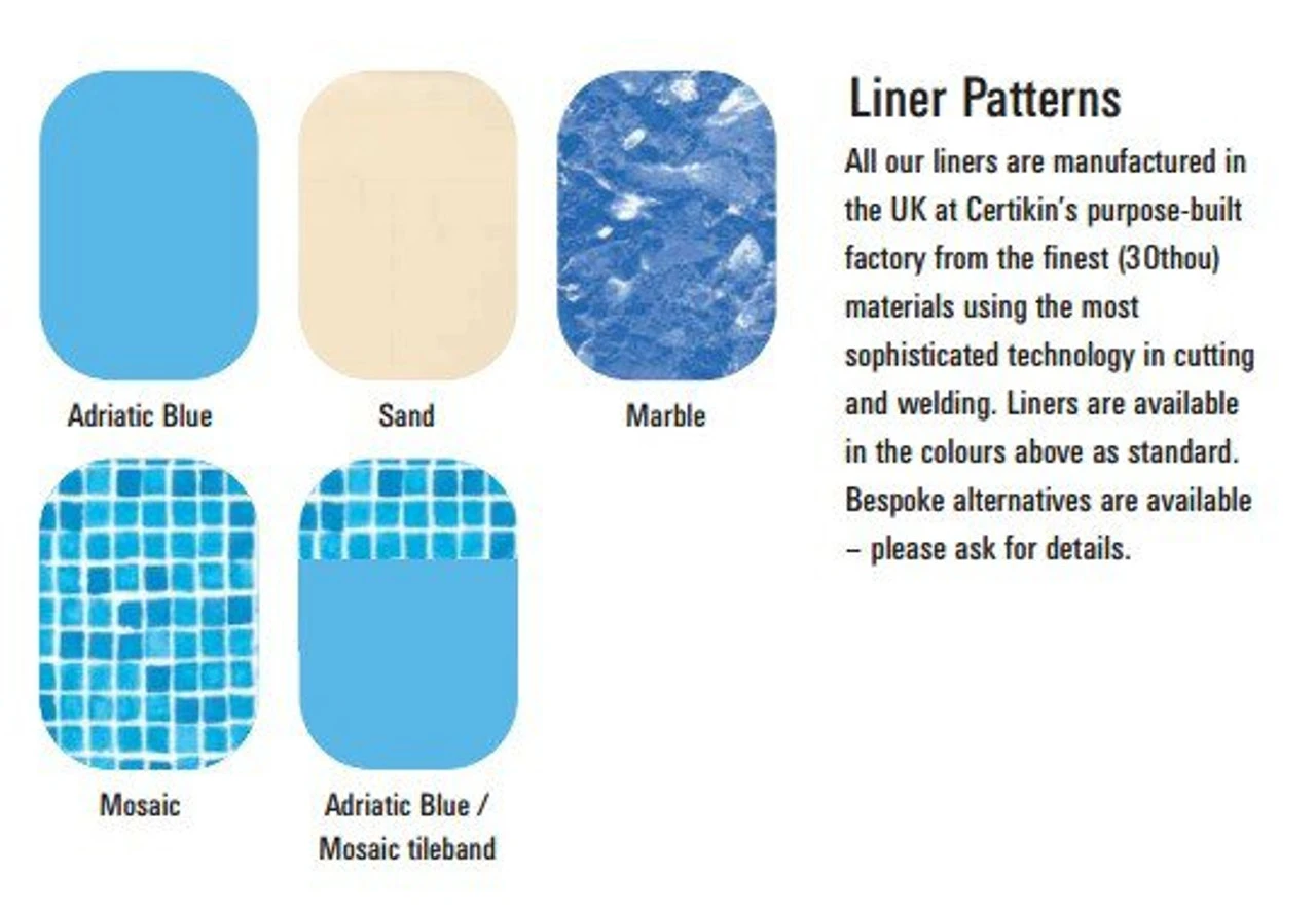 The Certikin pool wooden walls and top are made of Scandinavian redwood to the highest specification. Packages come complete with steps, Certikin flow fittings, filtration, maintenance kit, cover and 30thou liner.