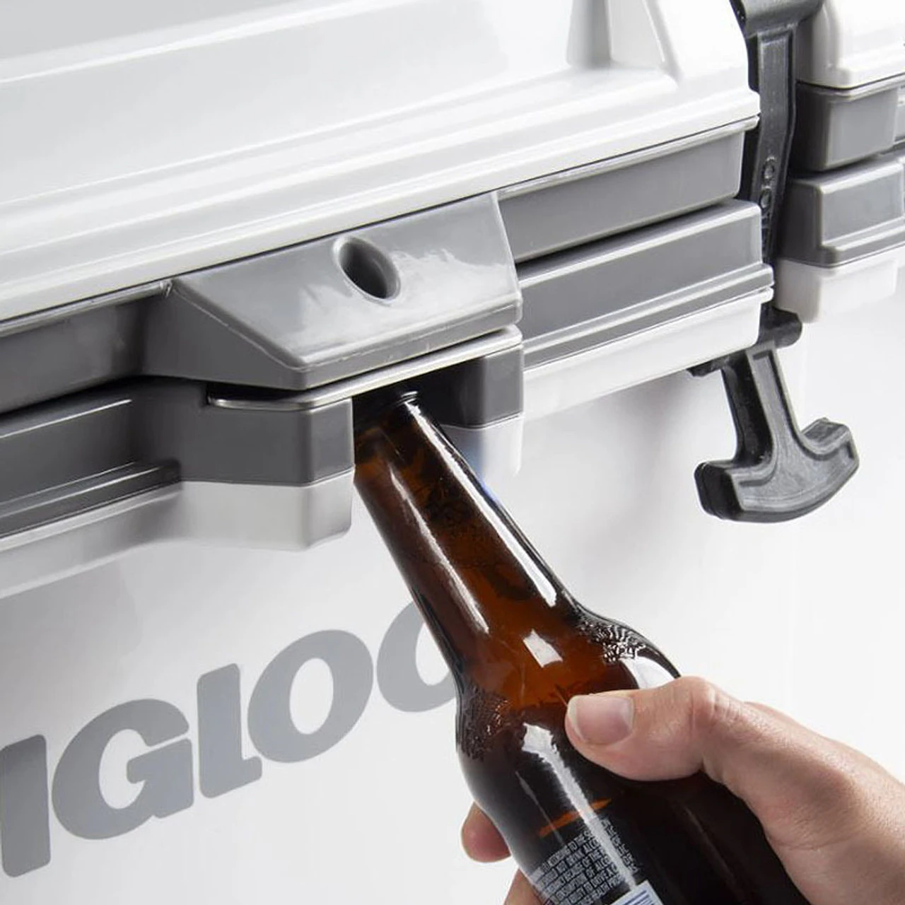 The Igloo IMX 70 cool box includes a multitude of features including an integrated stainless steel bottle opener, cup holders, anti-skid feet, a lockable lid, molded side handles, rubber lid gasket, steel braided swing-up cable handles, tie-down points, self-stopping lid hinges, marine-grade rubberized lid latches, threaded drain plug, a removable wire basket to keep items cold and dry. The IMX 70 cool box also features a fish measuring ruler!
